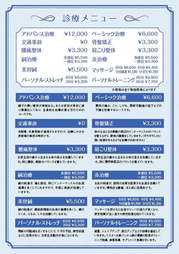 症状や部位数によって料金が異なりますので、詳しくはスタッフまでお問い合わせください。